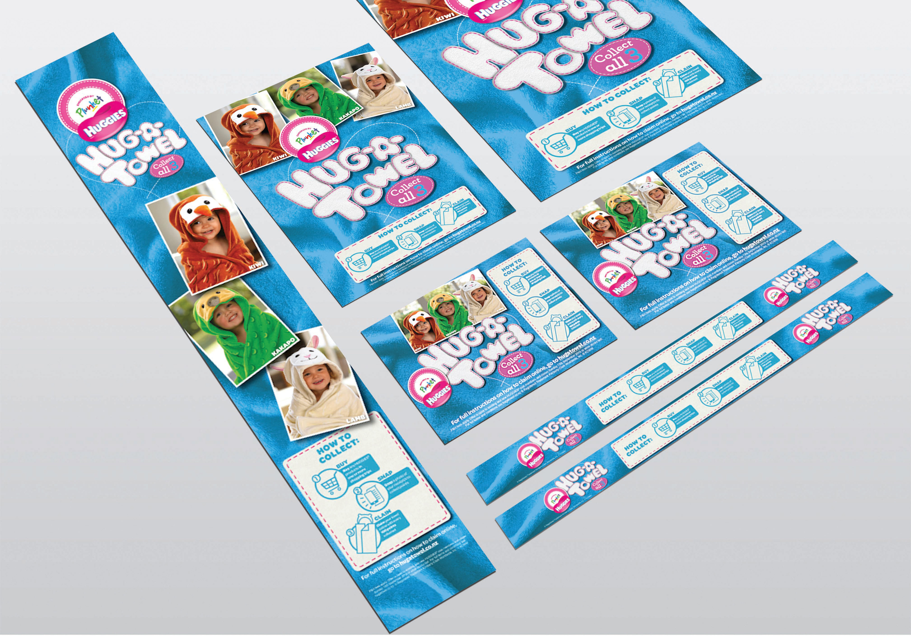 Graphic pieces designed for supermarkets and stores for a Huggies NZ Campaign claiming Kid’s towels of New Zealand Native animals created by BTL Agency.